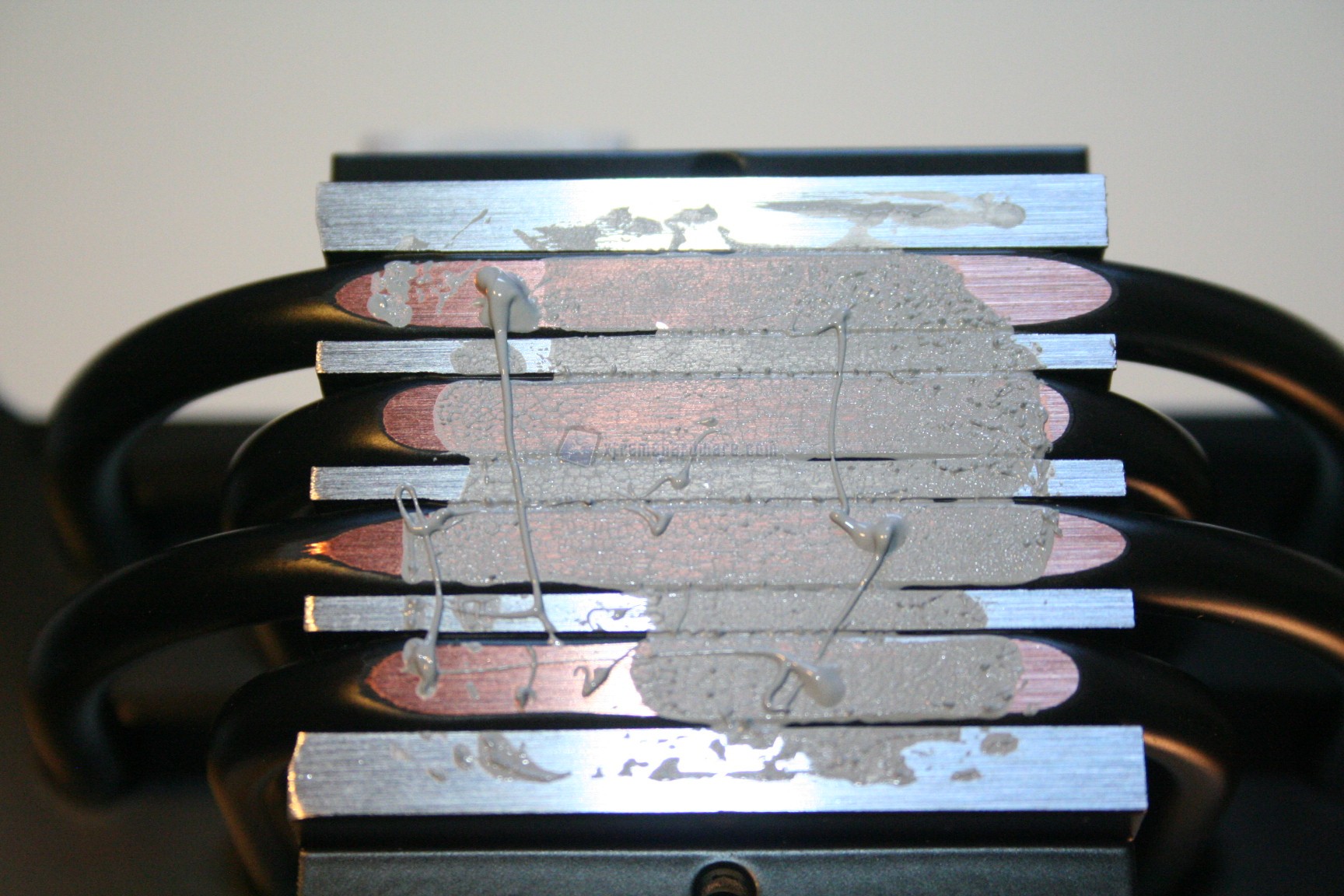 Come potete osservare, nella prima fotografia è presente un contatto parziale. Con le basi HDT consigliamo una applicazione simile alla seconda, riempendo i gap delle heatpipes con un leggero strato di pasta termoconduttiva. A tal proposito, la pasta è la medesima fornita nei dissipatori Enermax, la Dow Corning TC-5121. Grazie all' adozione della ventola da 120mm e grazie al sistema di montaggio regolabile è possibile rialzare la ventola frontale, però ciò comporterà un aumento dell' altezza complessiva ed una leggerissima perdita di efficienza di dissipazione termica, ragion per cui sconsigliamo di utilizzare questo metodo.